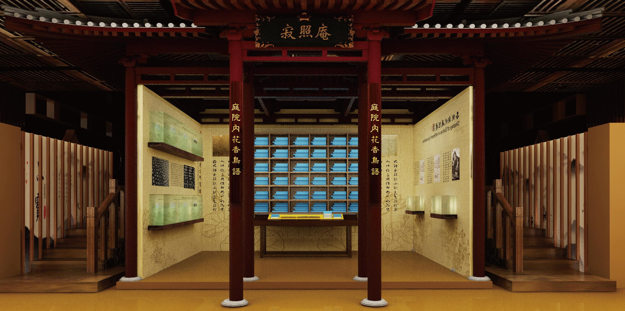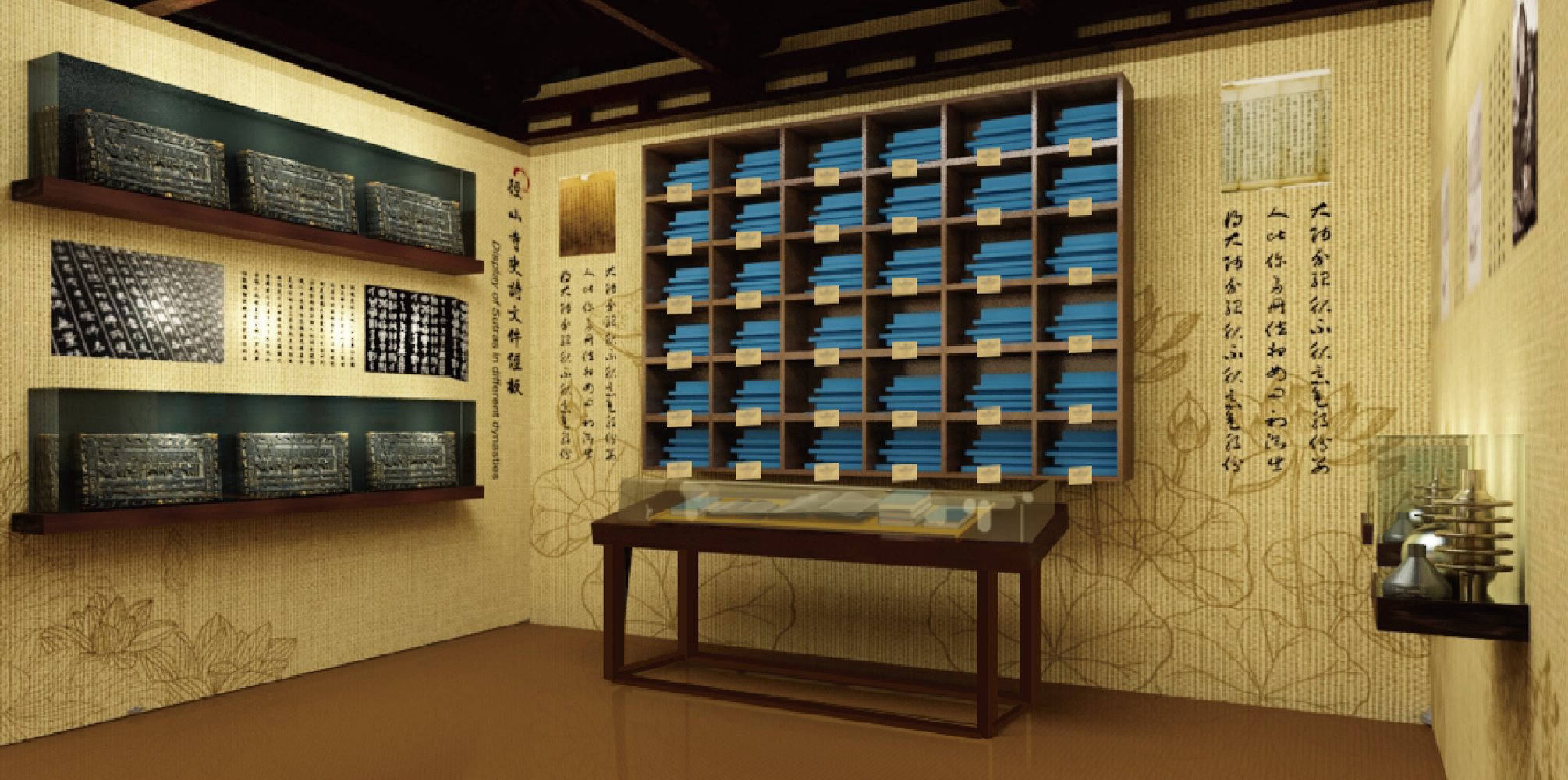寂照庵中,用了藏經(jīng)閣經(jīng)書陳列的靈感,將經(jīng)書整齊排放分別展示大藏經(jīng)的影響,重要性和出土過程。